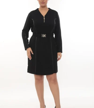 Čierne šaty s polozipsom, koženkovými detailmi a opaskom