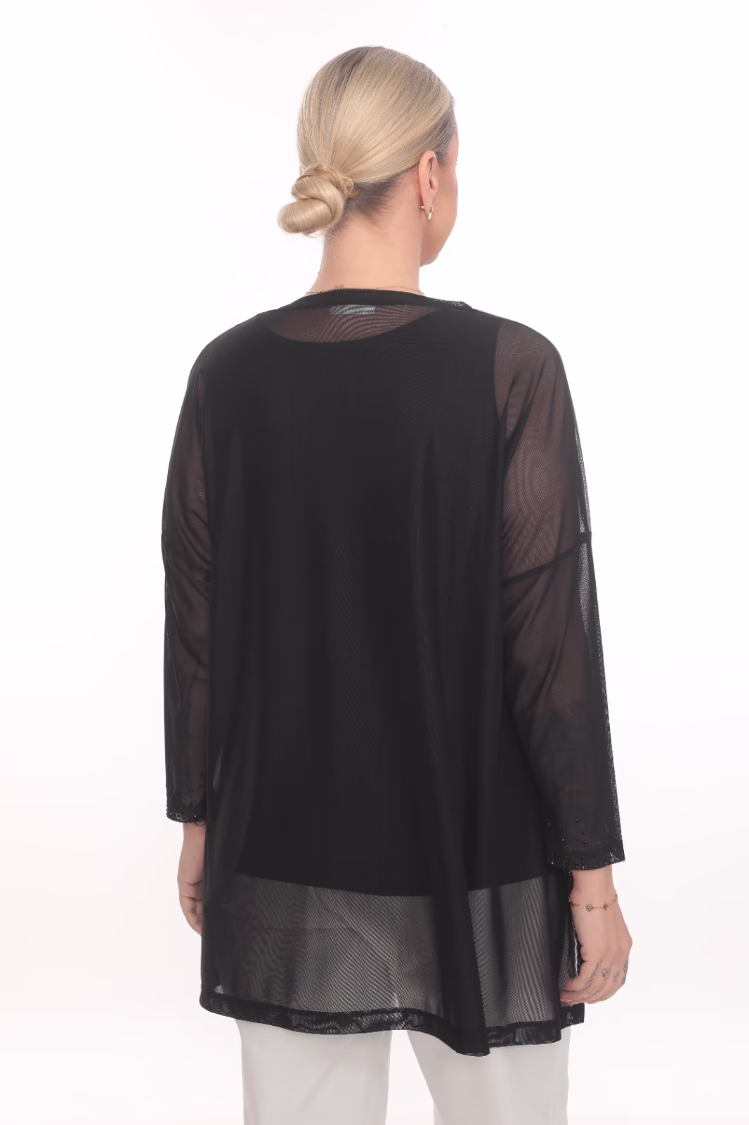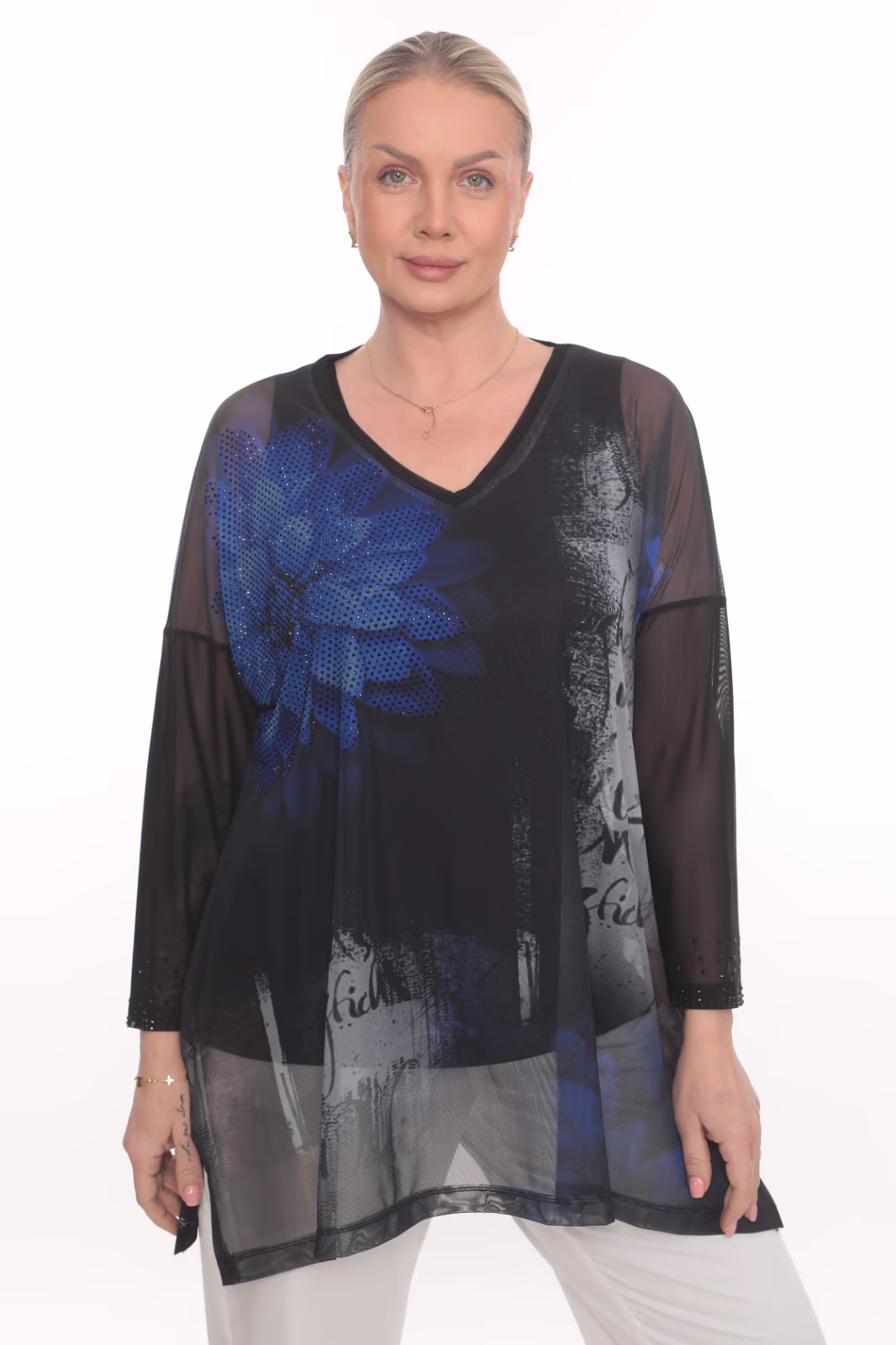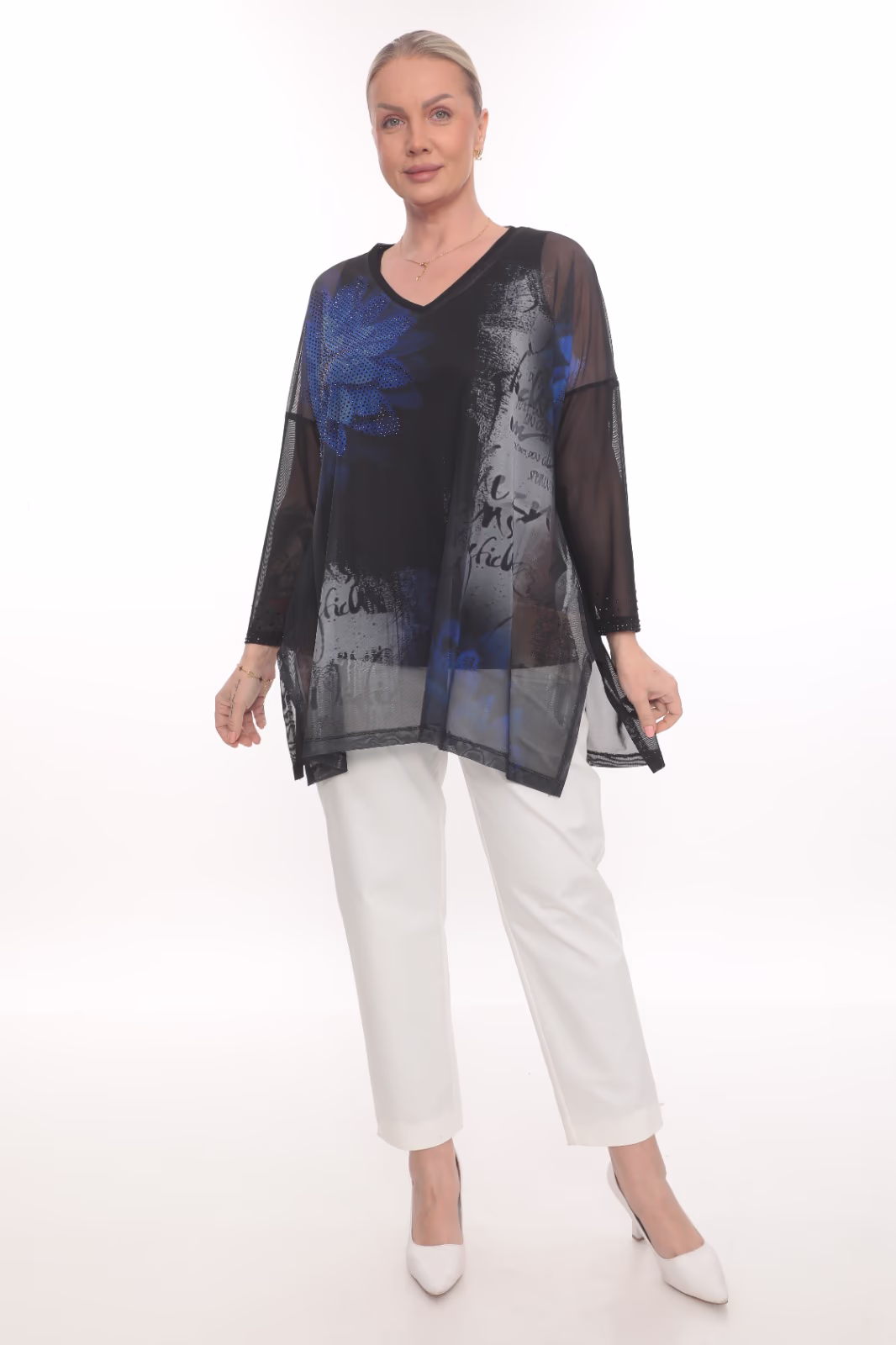Ľahká dámska tunika z jemnej sieťoviny v čiernej farbe s výraznou modro-sivou potlačou. Voľný, predĺžený strih a V-výstrih – ideálna na vrstvenie.